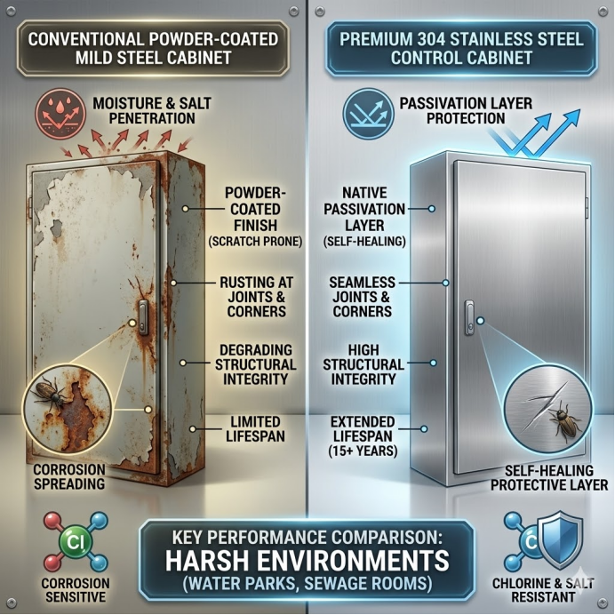 สำหรับสภาพแวดล้อมที่มีความชื้นสูงและมีคลอรีนสูง (สารฆ่าเชื้อ) เช่น สวนน้ำและห้องบำบัดน้ำเสีย วัสดุของตู้ควบคุมมีความสำคัญอย่างยิ่ง: