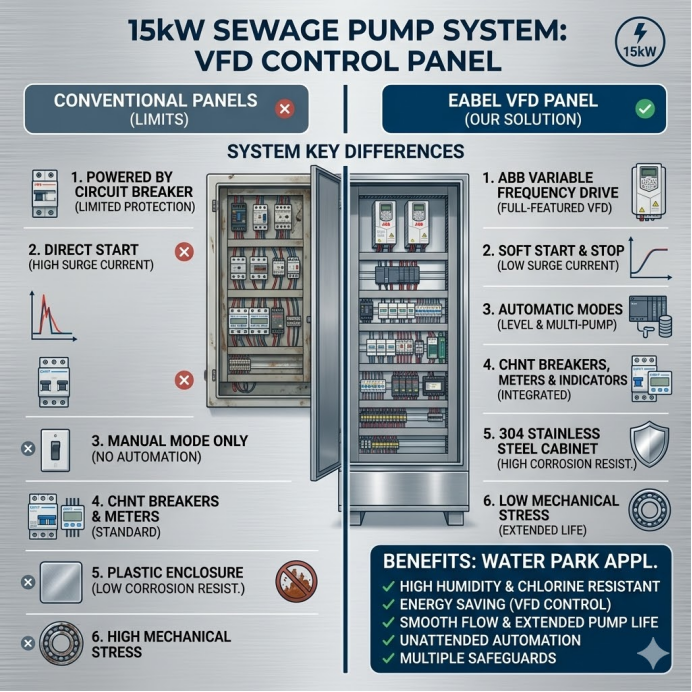 สำหรับปั๊มสูบน้ำเสียขนาด 15 กิโลวัตต์ คุณภาพของระบบควบคุมไฟฟ้าไม่เพียงแต่เกี่ยวข้องกับความปลอดภัยด้านไฟฟ้าเท่านั้น แต่ยังส่งผลโดยตรงต่ออัตราการล้มเหลวของเครือข่ายท่อทั้งระบบอีกด้วย จากมุมมองเชิงวิชาการและวิทยาศาสตร์อย่างเป็นทางการ บทความนี้จึงนำเสนอการวิเคราะห์เปรียบเทียบอย่างลึกซึ้งเกี่ยวกับหลักการออกแบบหลักของแผงควบคุมแบบครบวงจรสำหรับปั๊มสูบน้ำเสียขนาด 15 กิโลวัตต์